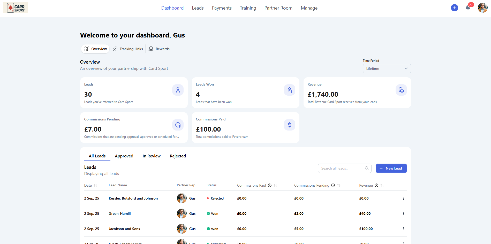 Your dashboard serves as the control center, providing real-time insights into your partnership performance across three key areas.