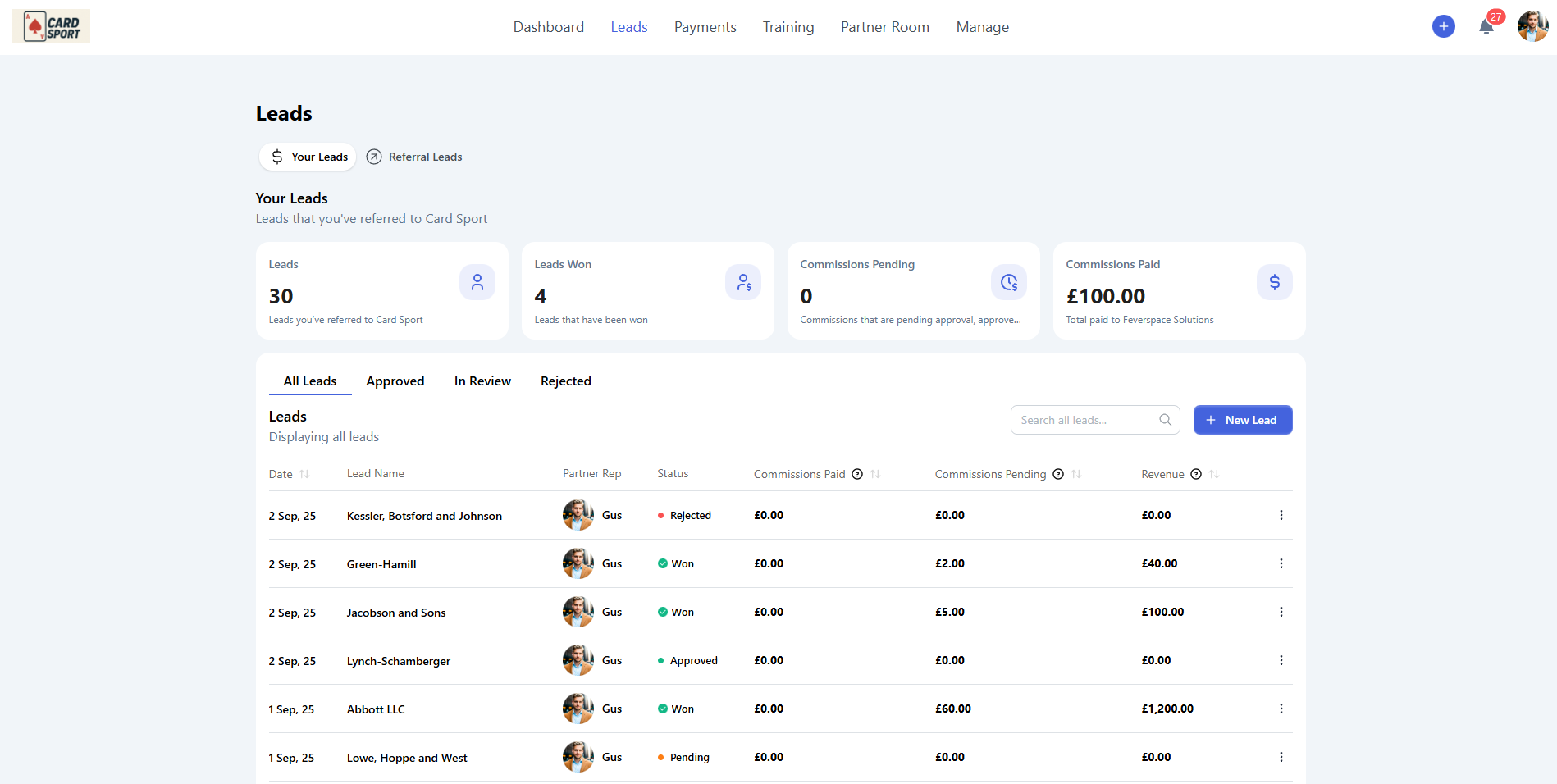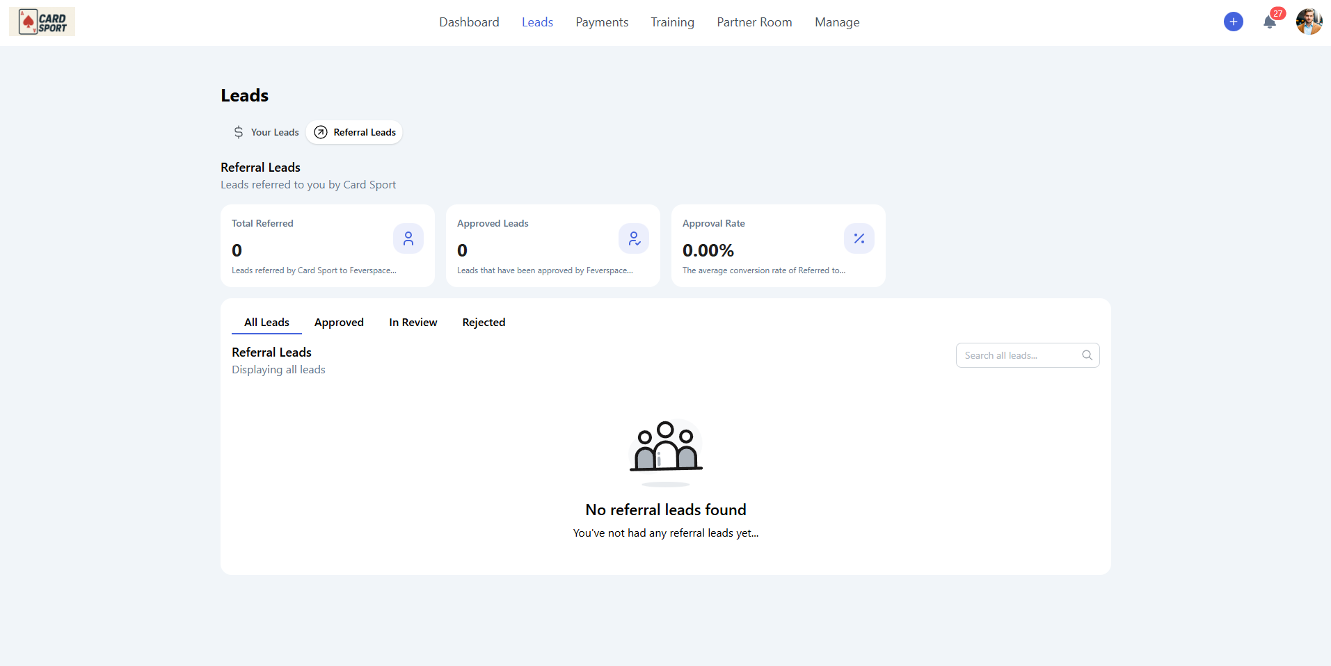 - View all leads with status filtering (All, Approved, In Review, Rejected)